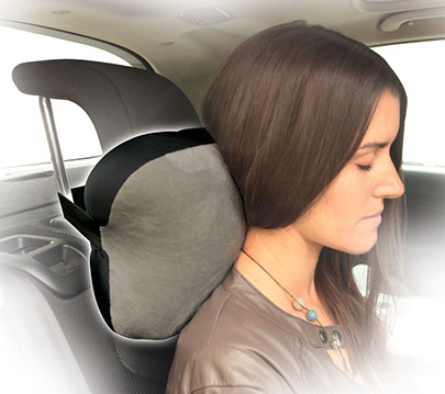 " Sans soutien, l’endormissement en transports s’effectue naturellement avec la nuque fléchie. Or la totalité du poids de la tête répartie sur un seul côté de la nuque est source de tensions musculaires importantes. Le cale nuque prodigue un maintien réel de l’ensemble de la nuque et de la tête, afin que les muscles cervicaux se relâchent,  et répartit la pression sur les articulations de manière harmonieuse. Le bouton pression de serrage permet d’apporter un maintien complet jusqu’à la mâchoire. "